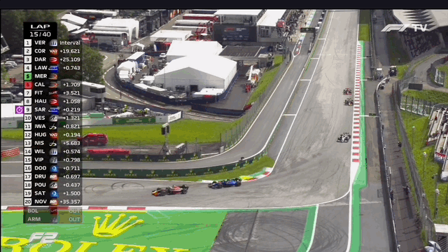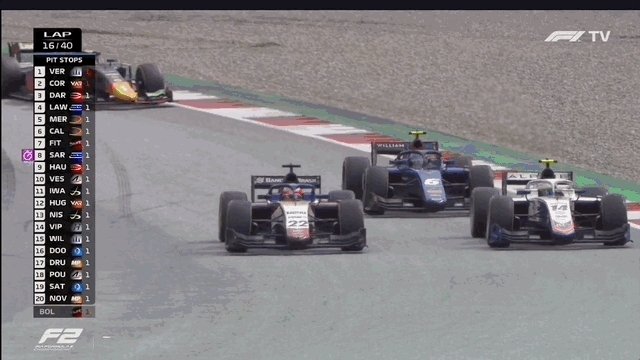 On those dry tires, Sargeant’s car just came to life. Even though the rest on the track were on a softer compound, Logan’s lap times didn’t give the drivers a ton to defend. The overtake above was a simple case of one care being faster than the other. At this point, 15 laps in, the track was drying, and cars could go two wide in response.